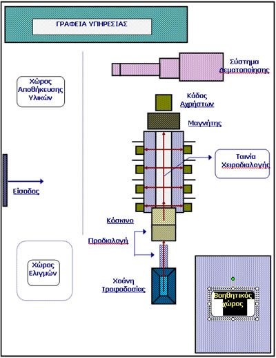 - Για την υποδοχή του όγκου των προσκομιζόμενων υλικών – στις περιπτώσεις που η χωρητικότητα της χοάνης δεν επαρκεί – στο κτίριο προβλέπεται χώρος υποδοχής όπου τα υλικά μπορούν να παραμένουν προσωρινά μέχρι την προώθησή τους για διαχωρισμό.